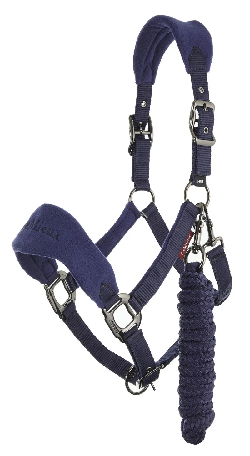A lovely soft headcollar featuring fleece inserts at the poll strap and nose band. These fleece inserts ensure even pressure distribution and are fitted with extra padding for the greatest possible wearing comfort. Cheek straps lined with fleece. Multi adjustable at the curb and poll strap (adjustable from both sides) Now with solid nickel buckles & fastenings. Each headcollar comes with a matching lead rope. LeMieux embroidery completes the range.