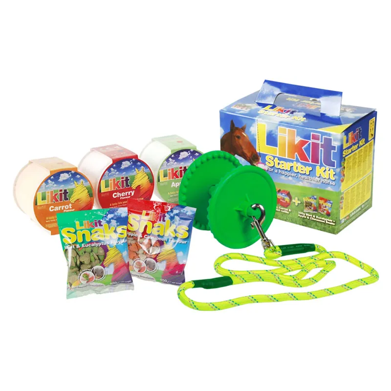 Each Kit contains a Likit Holder, three assorted Likit (650g) refills as well as two bags of the popular Likit Snaks.