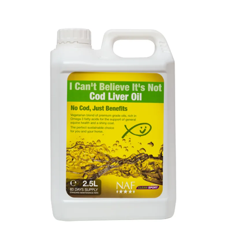 NAF are proud therefore to offer you and your horse this blend of premium quality vegetarian oils, which provide an ethical alternative to Cod Liver Oil. Cod Liver Oil is renowned for being rich in Omega 3 and 6 fatty acids, and these are now also provided by I Can’t Believe It’s Not Cod Liver Oil. Research highlights the benefits of Omega 3 and Omega 6 for general health, and there is evidence that they may support joint health, immunity and a shiny coat. Benefits for your horse • Vegetarian • Low aroma and highly palatable • Rich in Omega 3 and 6 fatty acids • Benefits for you • Ethical – no use of endangered cod stocks • Economical and superior quality